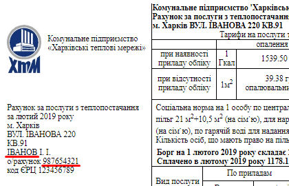 Якщо Ви не пам'ятаєте Особовий рахунок, Ви можете знайти його на роздруківці рахунку за послуги КП «ХТМ». Написання прізвища має бути ідентичним вказанному на роздруківці рахунку (без ініціалів). Приведений нижче малюнок допоможе Вам знайти необхідні дані на роздруківці.