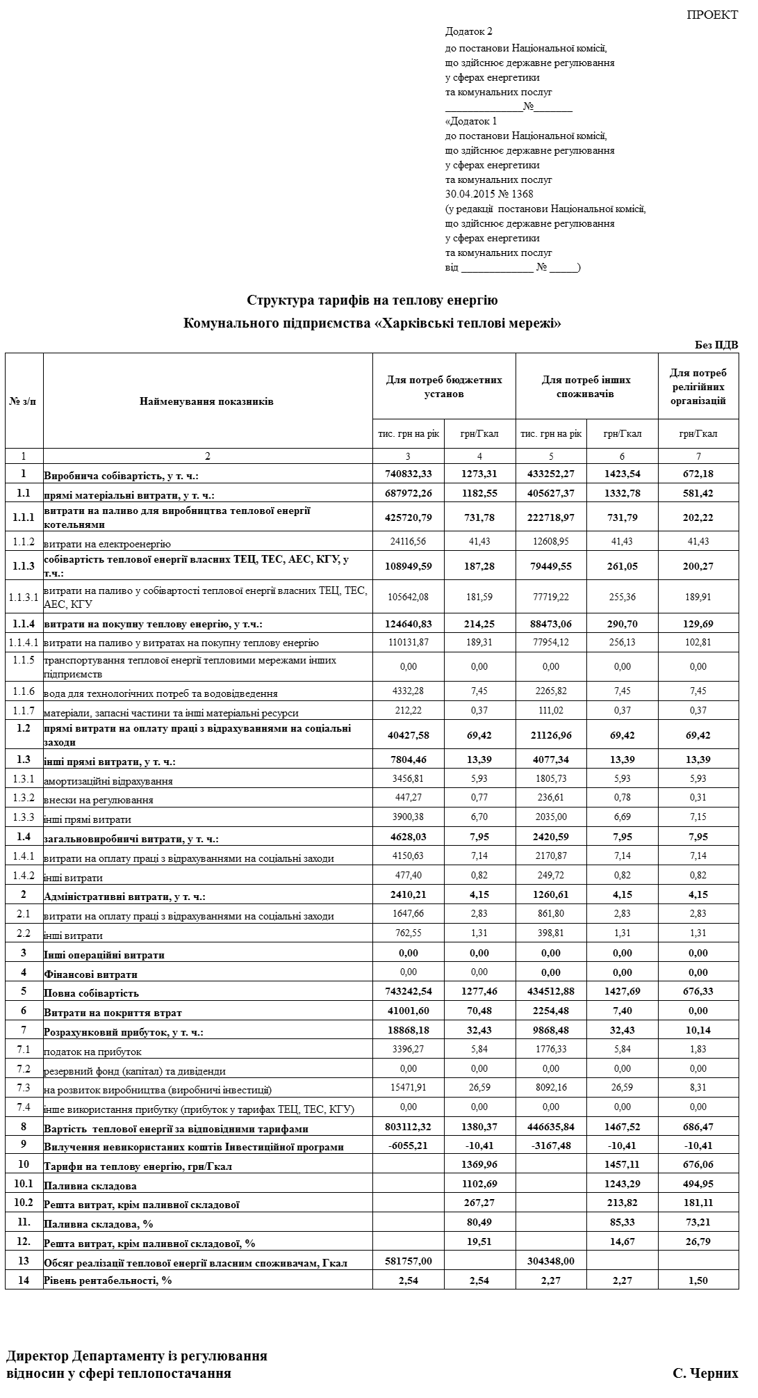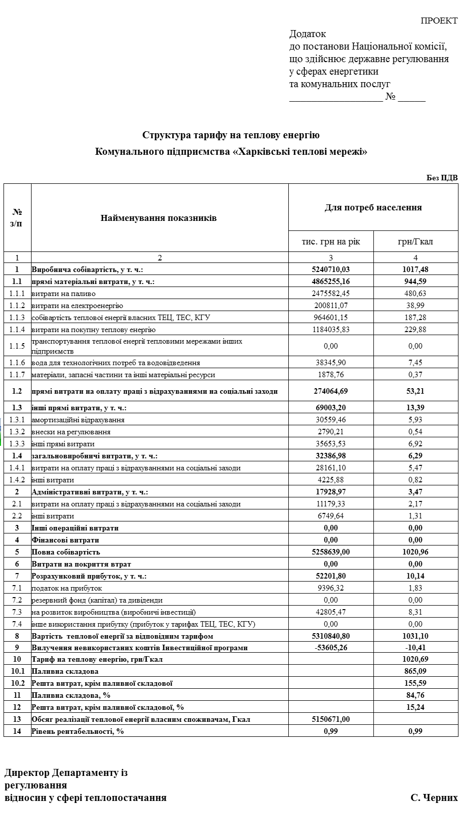 - проект постанови «Про встановлення тарифів на теплову енергію, її виробництво, транспортування, постачання для потреб населення КОМУНАЛЬНОМУ ПІДПРИЄМСТВУ «ХАРКІВСЬКІ ТЕПЛОВІ МЕРЕЖІ»