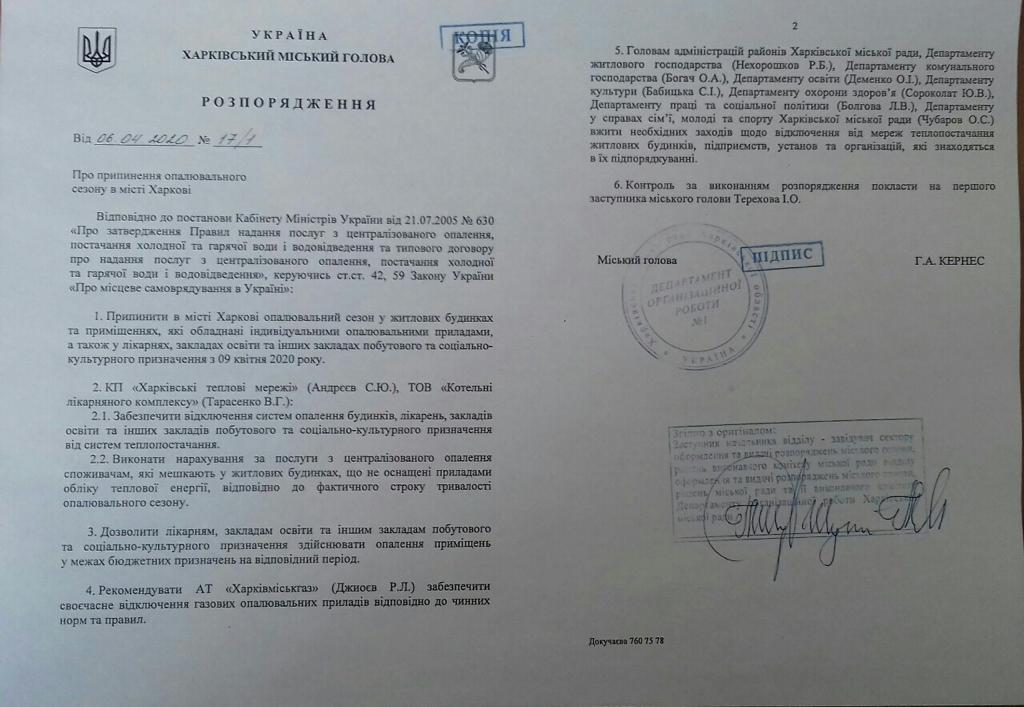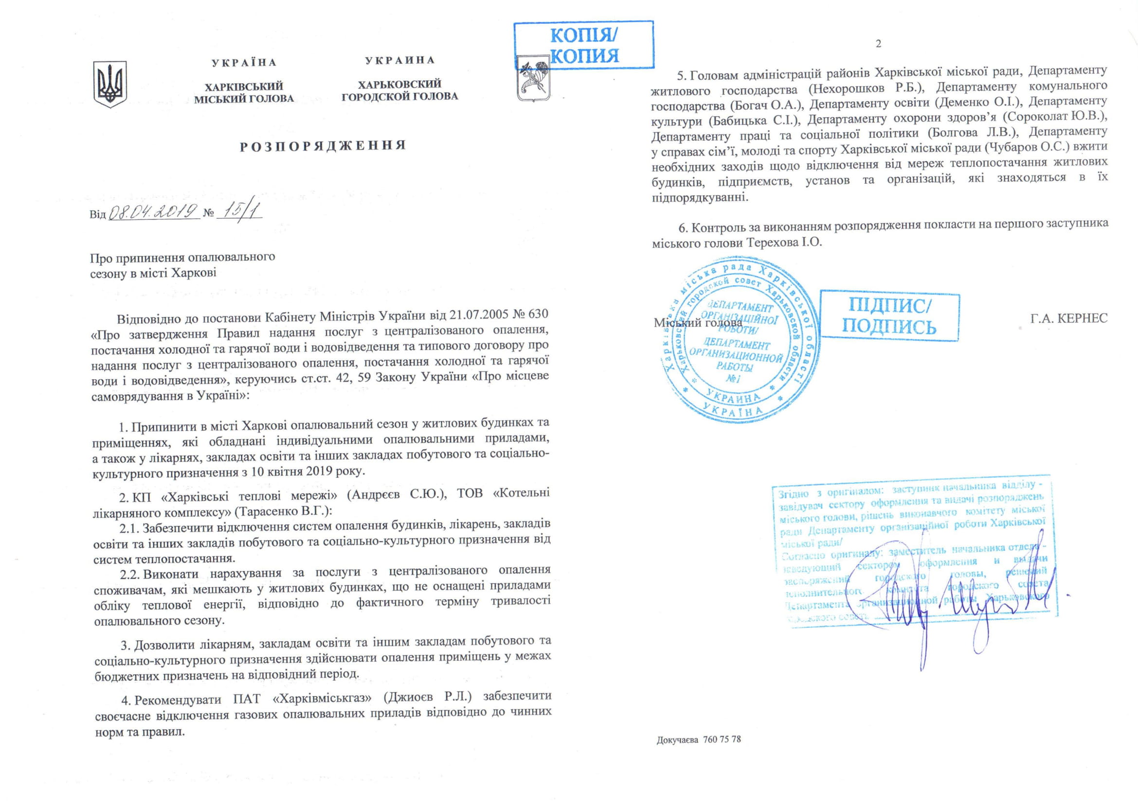 Розпорядження про припинення опалювального сезону в місті Харкові, дивитися далі ...
